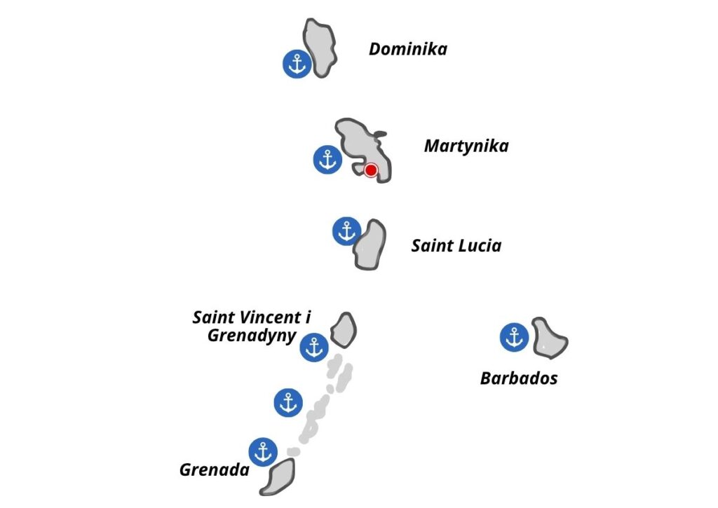 - Z Martyniki łatwo odwiedzić St. Lucie (25 Mm). Dysponującym większą ilością czasu polecamy Grenadyny oraz Tobago Cays (ok. 120 Mm). Trzeba jednak pamiętać, że są to trasy dla prawdziwych miłośników żeglarstwa z falami i silnym, regularnym wiatrem. Kto preferuje jachting powinien raczej wybrać region BVI.