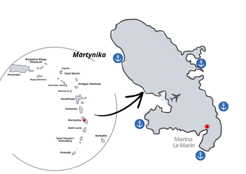 Większość jachtów stacjonuje w Marinie Le Marin znajdującej się na południowo-zachodnim wybrzeżu Martyniki. Dojazd z lotniska zajmuje ok. 45 minut.