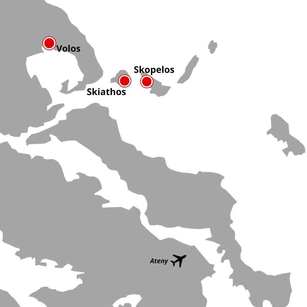 Na Skiathos znajduje się międzynarodowe lotnisko, niestety trudno o loty bezpośrednie z Polski. Jeszcze trudniej znaleźć loty w soboty do Volos. Tu z pomocą przychodzą połączenia z Niemiec, np. Eurovings lub Aegean z Düsseldorfu.