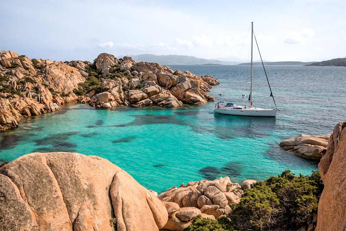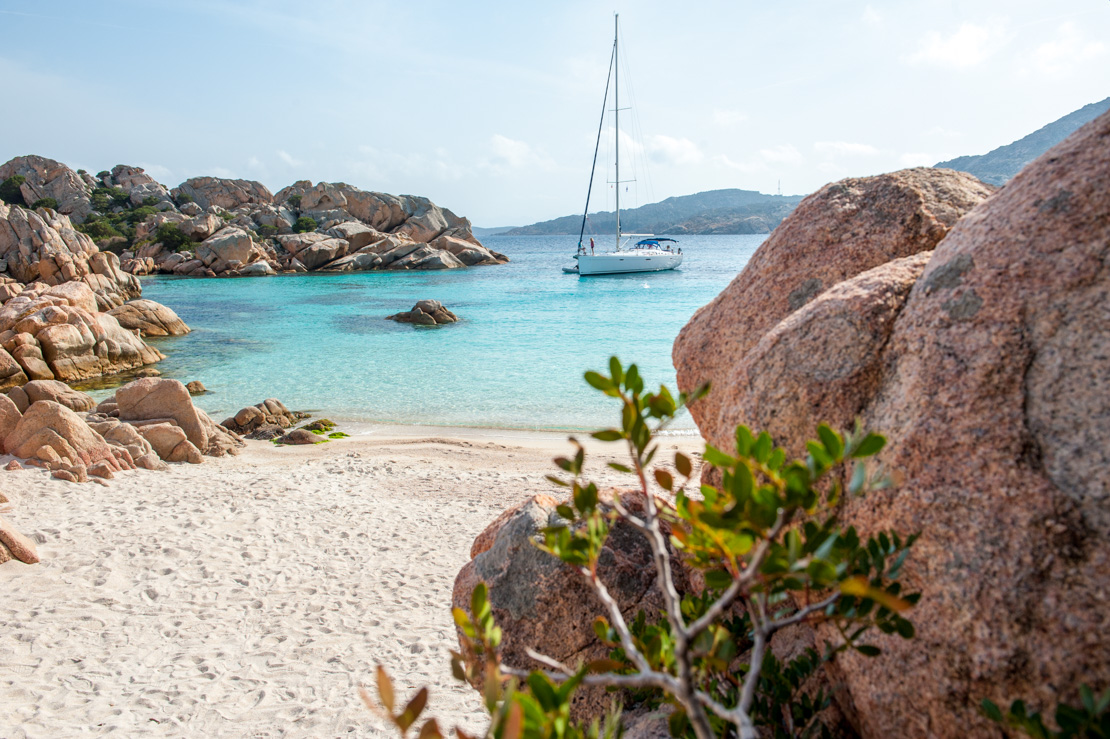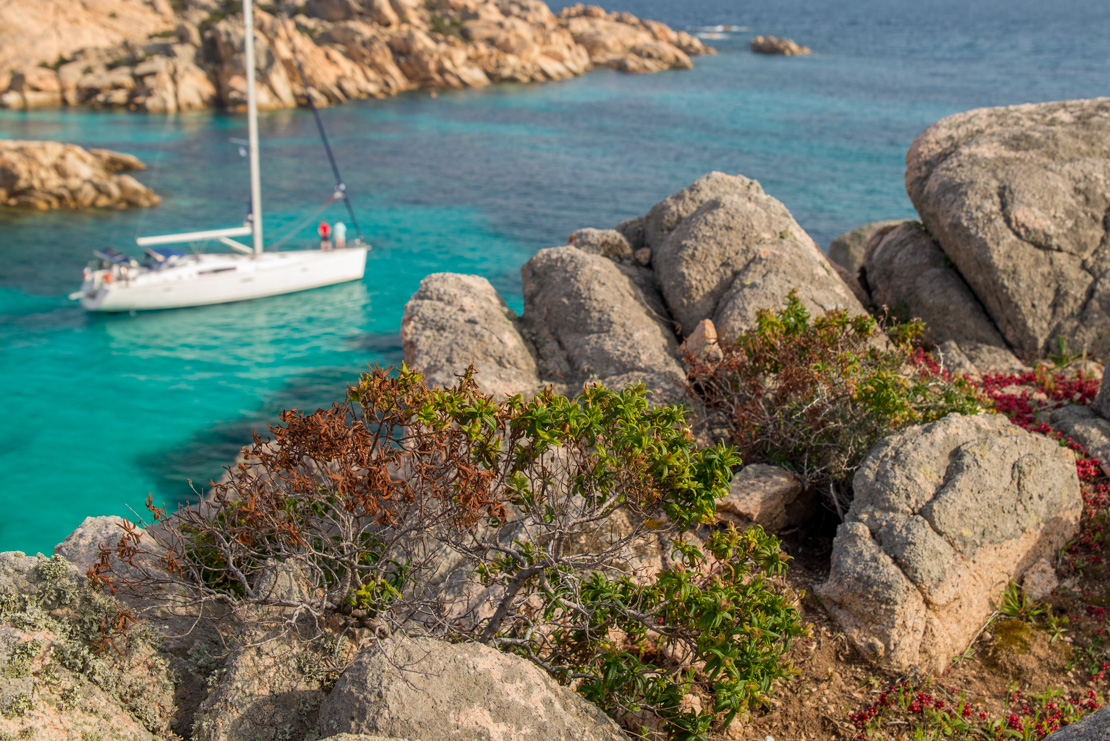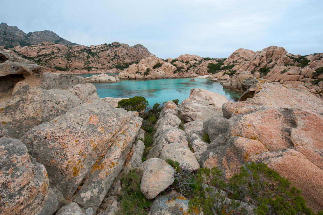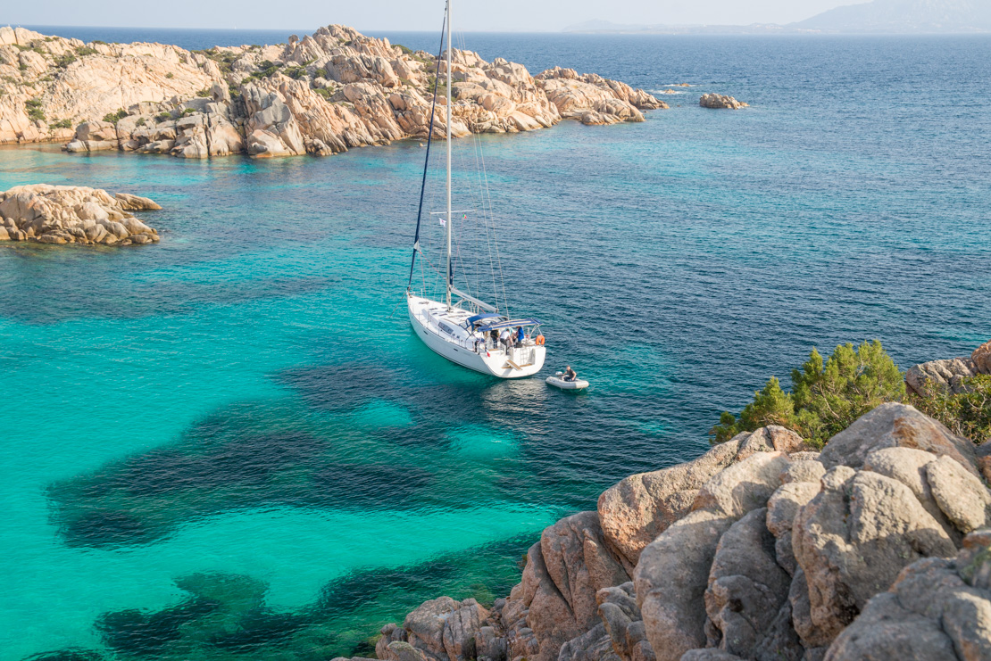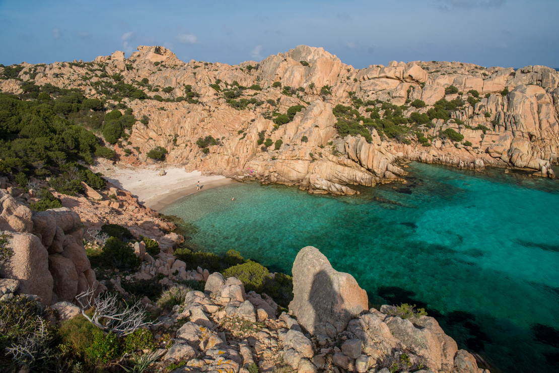 - Cala Coticcio jest nazywana inaczej „Little Tahiti” ze względu na kolor morza przypominający turkus zatoki Morza Karaibskiego. Jej poszarpana, niezwykle malownicza linia brzegowa jest zbudowana z olbrzymich, wystających głazów o fantazyjnych kształtach. To jedno z „kultowych” miejsc w Parku La Maddalena, które koniecznie trzeba zobaczyć. Zapewnia dobrą ochronę przed wiatrami od zachodu, aż po południowy wschód. Warto jednak uważać na silne wiatry z zachodu, które potrafią „spłynąć” z góry. Zatoka jest dość mała i tłoczna. Przy niesprzyjającym wietrze lepiej przepłynąć 1,5 mili na południe, w kierunku Cala Portese, gdzie można skorzystać z jednej z licznych bojek.