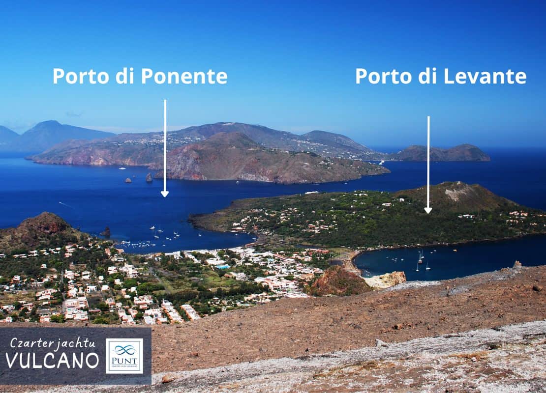 - Porto di Levante – osłonięta od wiatrów wiejących z zachodu, jest głównym miejscem postoju na wyspie. To tutaj cumują promy łączące Vulcano z pozostałymi Wyspami Liparyjskimi, jak również z Milazzo na Sycylii oraz z Neapolem. Cumować możemy do pływających pomostów (uwaga na fale) w dwóch marinach: di Levante (w południowej części zatoki) oraz w Marinie di Vulcanello (bardziej na północy – dalej od centrum). Tutaj również znajdziemy około 10 boi. Można również kotwiczyć zwracając uwagę na gwałtownie opadające dno. Najlepiej trzymać się blisko plaży gdzie głębokość utrzymuje się na 5 metrach.