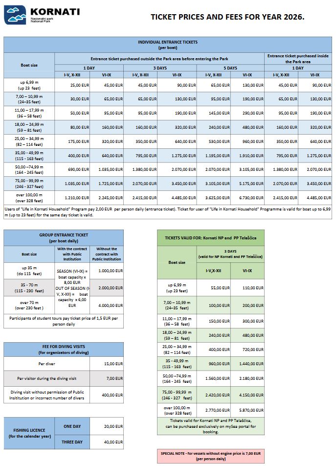 Cennik możesz również otworzyć w pdf: cennik 2026 Park Narodowy Kornati.