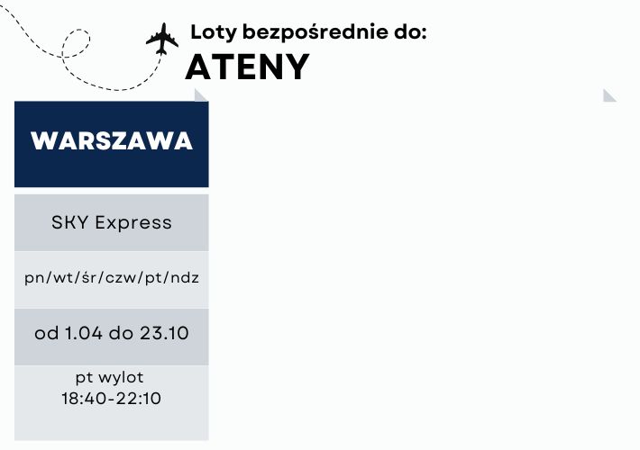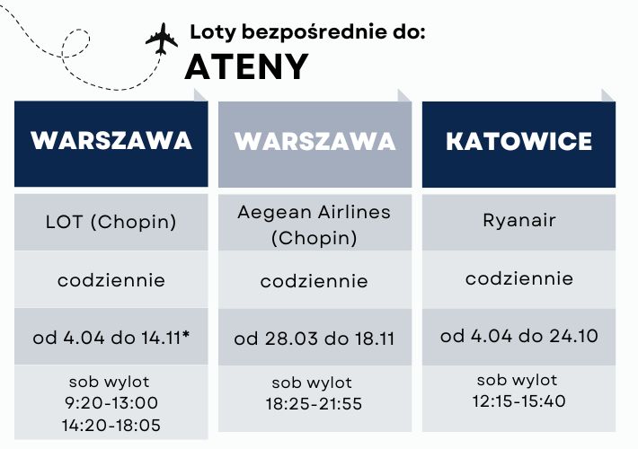 W sezonie 2026 bezpośrednio do Aten z Warszawy (Chopin) polecimy z polskim przewoźnikiem LOT. Oferuje on połączenia w każdy dzień tygodnia. W soboty, od 4 kwietnia do 14 listopada, nawet dwa razy dziennie w bardzo dobrych godzinach.