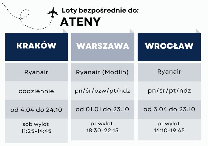Południe Polski ma powody do zadowolenia. Tania linia lotnicza Ryanair oferuje atrakcyjne połączenia do Aten w soboty z Katowic i Krakowa. Niestety zabrakło sobotnich połączeń z Warszawy i Wrocławia. Z tych portów (alternatywnie) można do Aten polecieć w piątkowy wieczór.