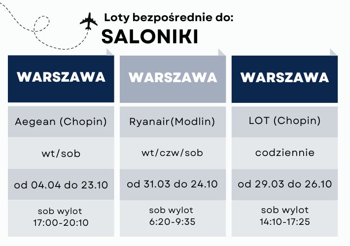 Bezpośrednie loty w soboty do Salonik z Warszawy (Chopin) znajdziemy u Aegean Airlines oraz w LOT. Ryanair również oferuje połączenia sobotnie na tej trasie, ale z lotniska w Modlinie.